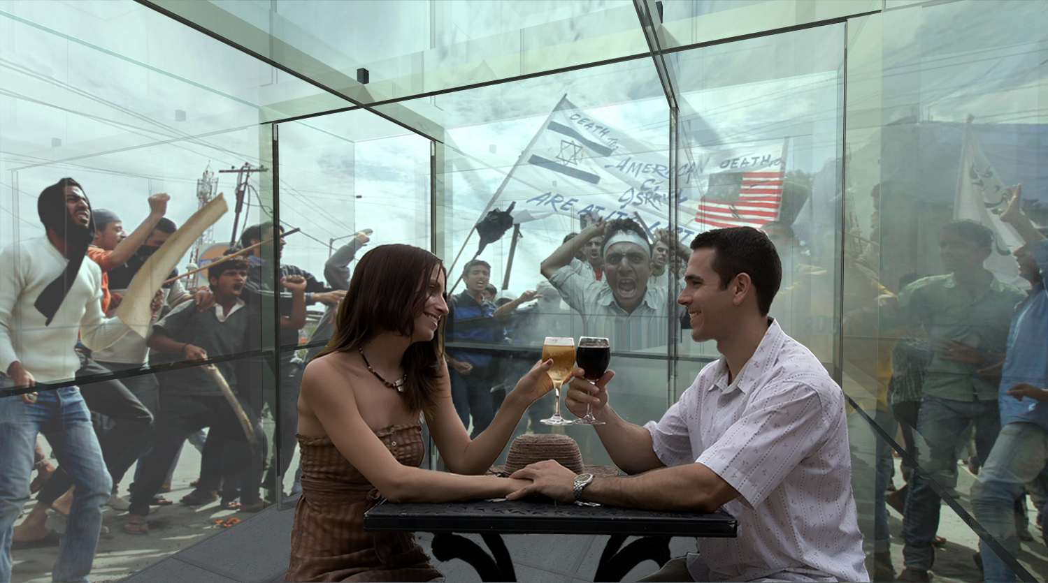 Družina se lahko zbere ob tradicionalnih praznikih, kot je božič pri nas ali zahvalni dan v Ameriki – zunaj lačna množica, znotraj preobložena miza s hrano. Iso-Cube je popoln kraj za romantično večerjo ali zaroko. Ni je ženske, ki bi zmogla zavrniti diamantni prstan znotraj steklene kocke z razgledom na policiste, ki pretepajo obupane brezposelne demonstrante. »Navsezadnje arhitektura ne more resnično spremeniti sveta. Lahko ga naredi le nekoliko lepšega. Vsaj za nekatere …«